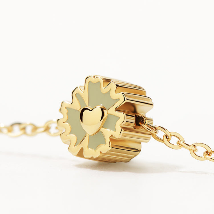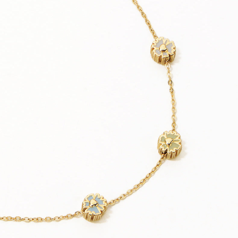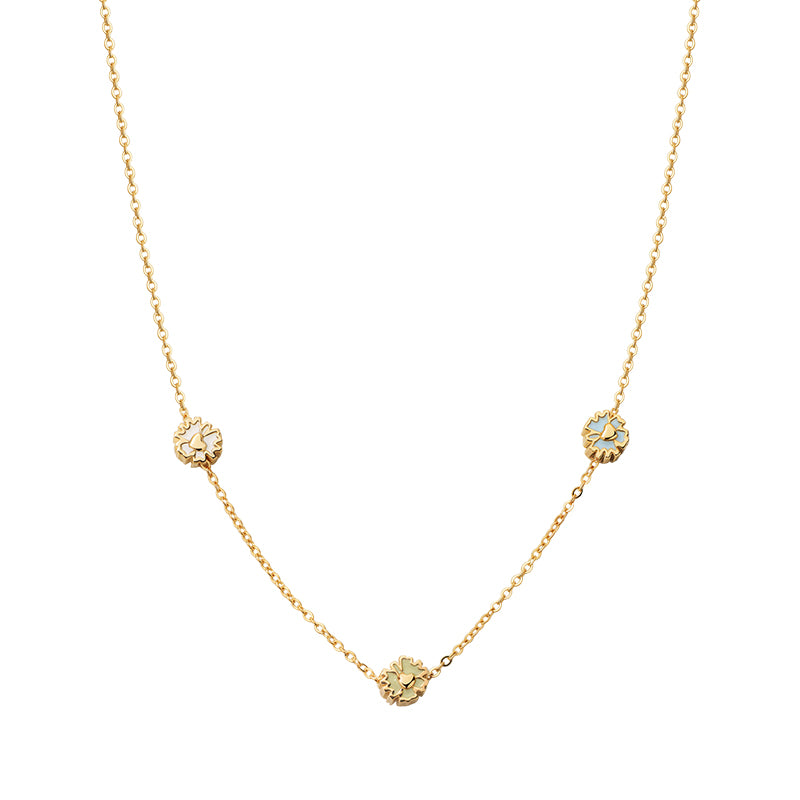 Each daisy bead is threaded on a classic cross chain and fitted with an internal silicone core, allowing you to slide and reposition them freely along the chain—making this piece truly your own.