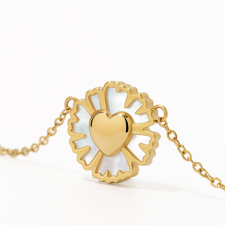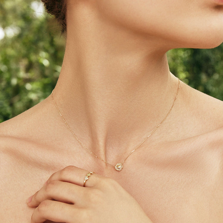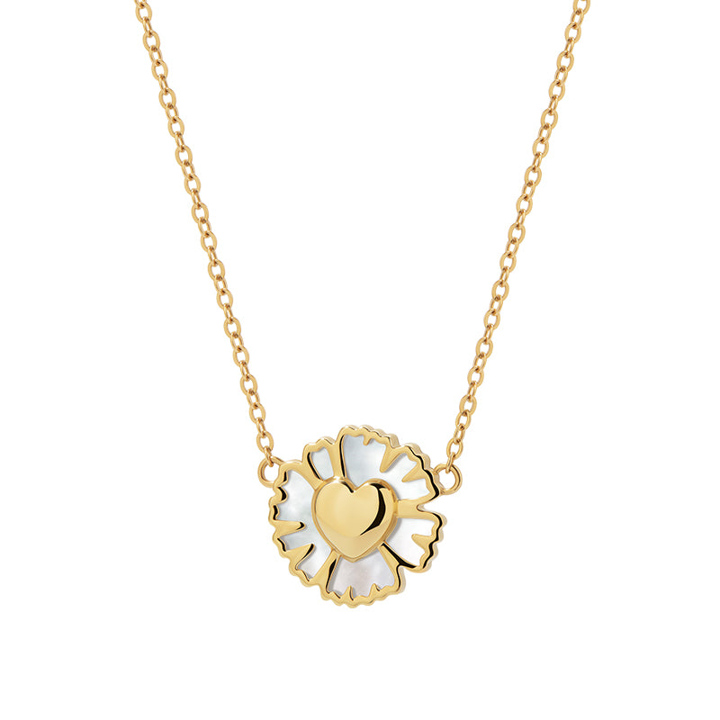 A soft shimmer of sunshine and serenity. The Daisy Heart Mother-of-Pearl Necklace features a delicate daisy charm crafted from solid 14K yellow gold, inlaid with radiant mother-of-pearl to reflect purity, calm, and grace. Strung on a refined cross chain, this elegant piece brings a natural glow to your everyday style.