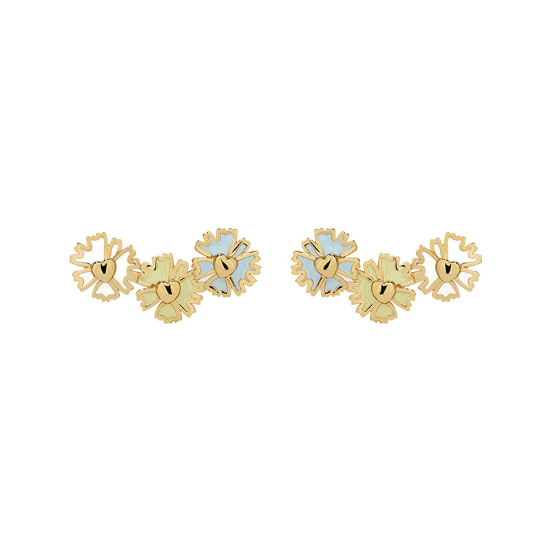 A dainty bloom with joyful charm. The Daisy Heart Tricolor Stud Earrings are crafted from solid 14K yellow gold, featuring a trio of low-temperature enamel daisies arranged vertically in a gentle arc. Each flower is hand-painted in soft pastel tones—sky blue, leaf green, and cloud white—to represent calm, growth, and clarity.