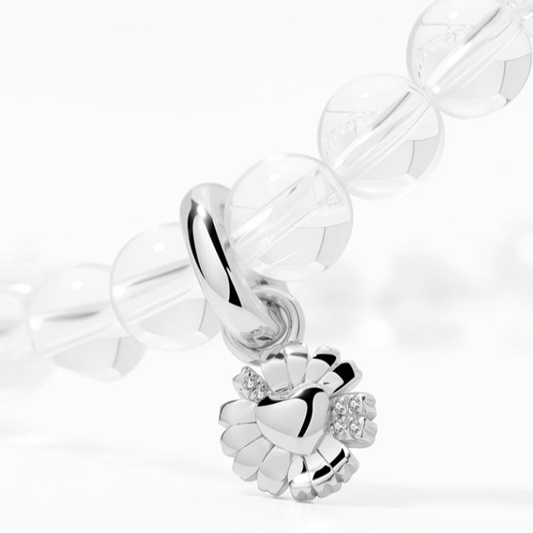 A soft touch of light for your wrist. The Daisy Heart Silver Crystal Bead Bracelet features natural white crystal beads strung on a comfortable stretch cord, centered with a delicate 925 sterling silver daisy charm accented with cubic zirconia.