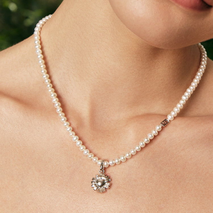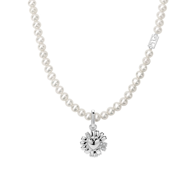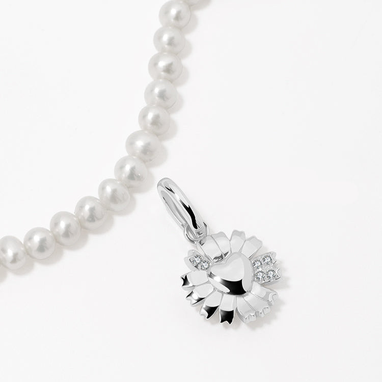 A graceful harmony of nature and joy. The Daisy Heart Silver Pearl Necklace features a statement 15 mm daisy pendant, delicately accented with cubic zirconia, suspended on a strand of 4–5 mm natural freshwater pearls.