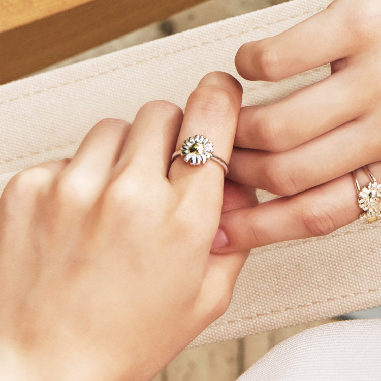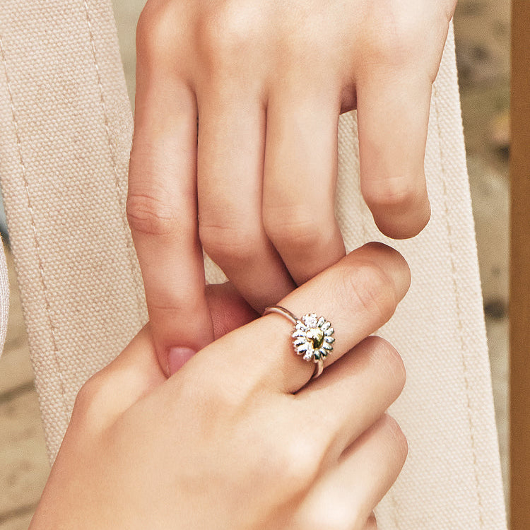 A blooming statement in contrast and grace. The Daisy Heart Silver Two-Tone Ring features a bold daisy motif in 925 sterling silver, finished with a soft two-tone plating for dimension and warmth. Set with cubic zirconia, this ring captures the spirit of delicate strength and everyday optimism.