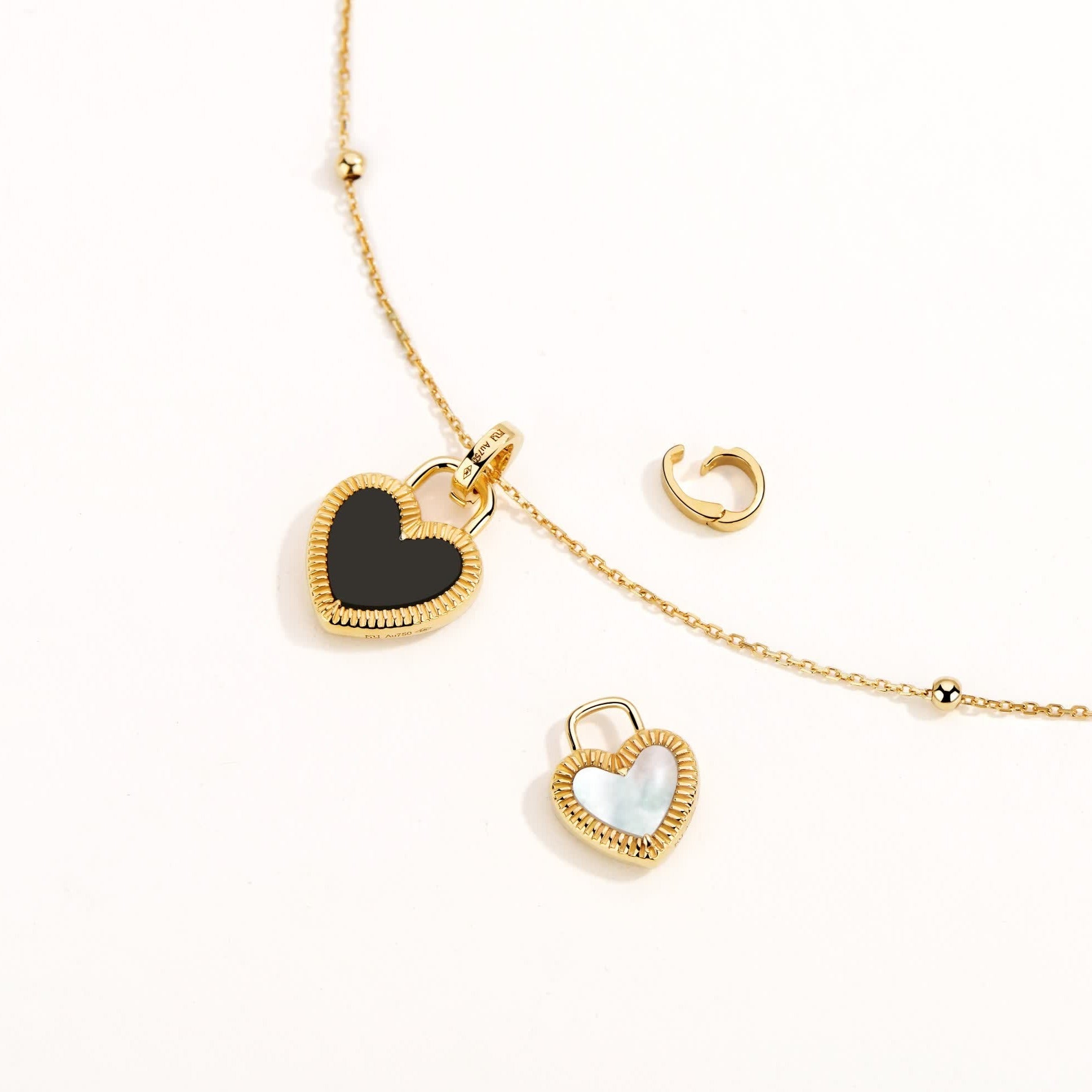 The elegance of duality—introducing the Flip Collection’s Double-Sided Hearts Pendant. Crafted from 18K solid gold, this versatile piece allows you to embrace both strength and softness. The powerful black onyx side symbolizes resilience, while the fearless white mother-of-pearl side represents purity and wisdom. A timeless and meaningful design, perfect for self-expression and everyday elegance.