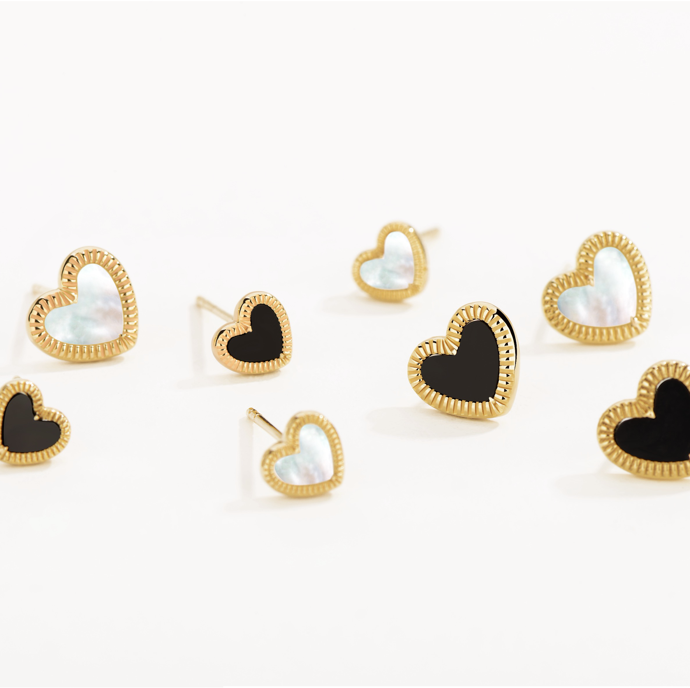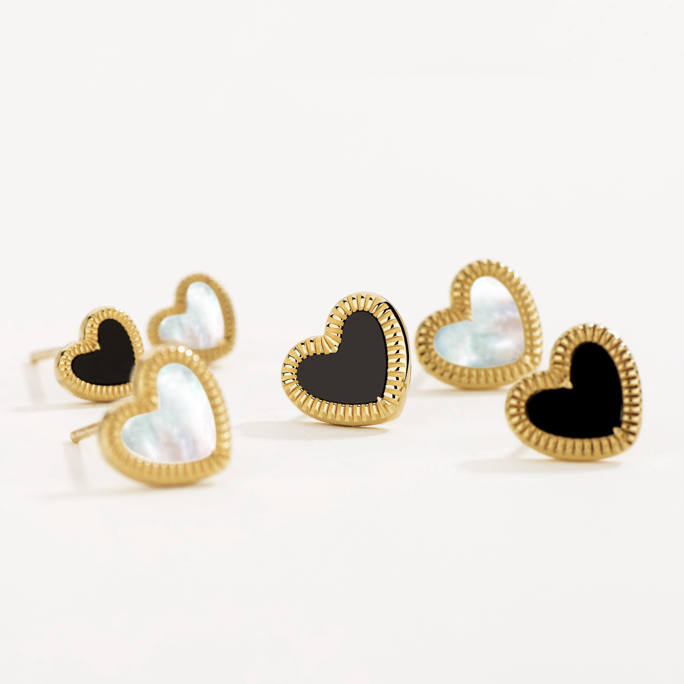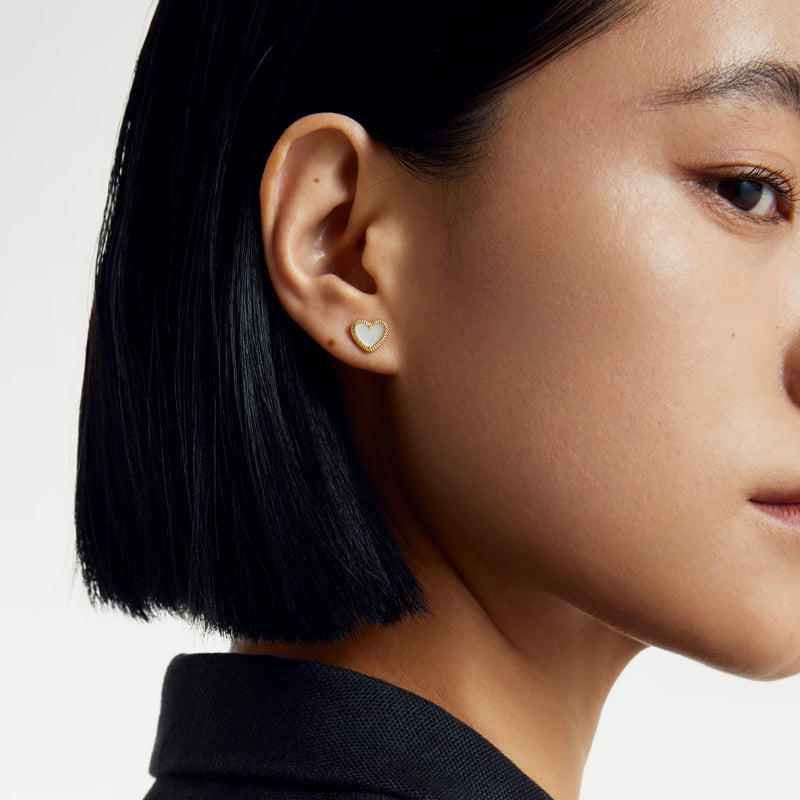 The elegance of duality—introducing the Flip Collection's double-sided heart stud earring. Crafted from 18K solid gold, this versatile piece features a reversible heart design, allowing you to wear black onyx for strength or white mother-of-pearl for purity. A perfect balance of boldness and softness, this earring is a timeless symbol of modern elegance.