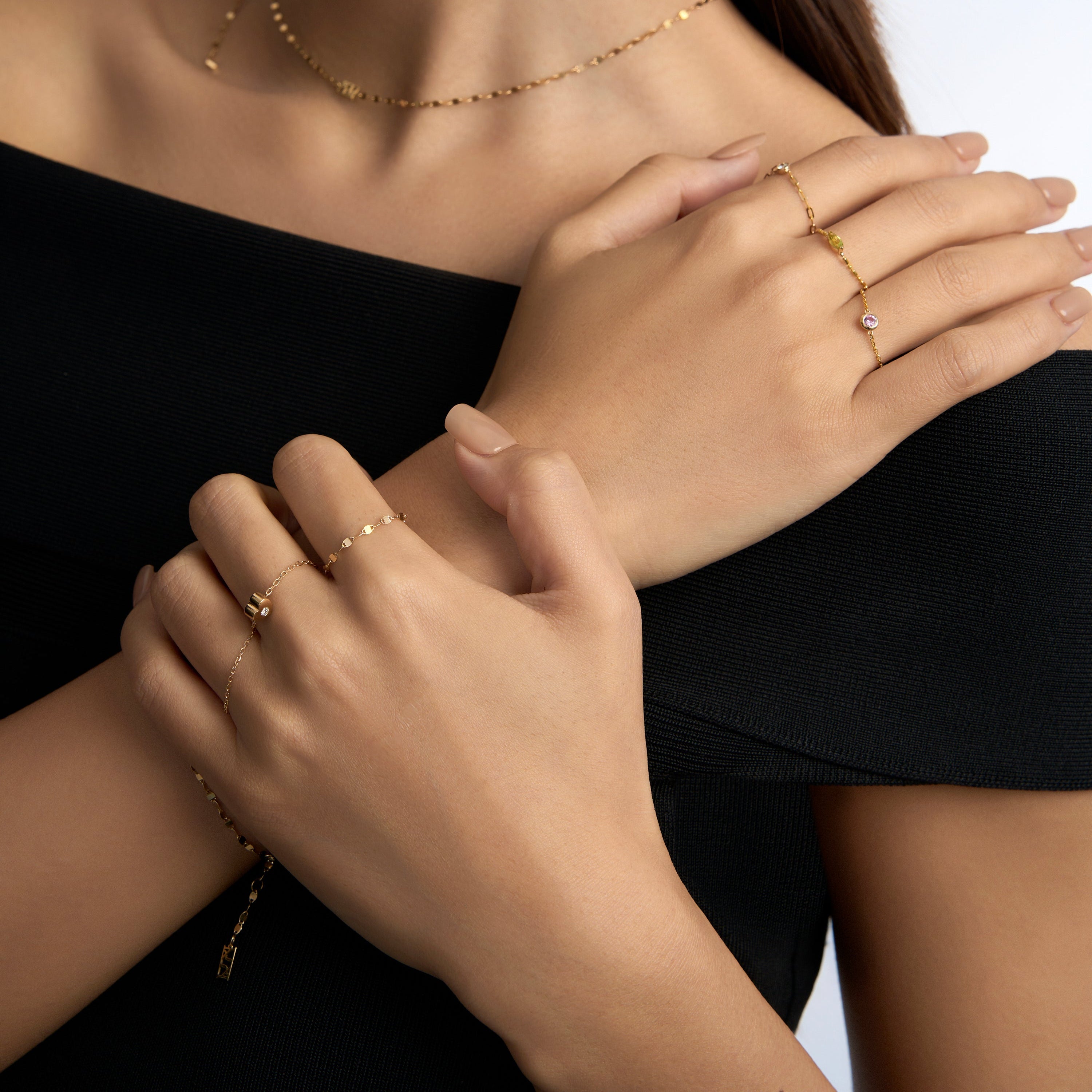 The Moment 18K Chain Ring embodies the beauty of minimal aesthetics and thoughtful design. Crafted in 18K solid gold, each ring is formed from a curated selection of fine chains, and specially designed pendant, offering a lightweight and effortlessly elegant feel. Designed for daily wear, this piece blends comfort and sophistication, making it a staple in your personal jewelry collection.