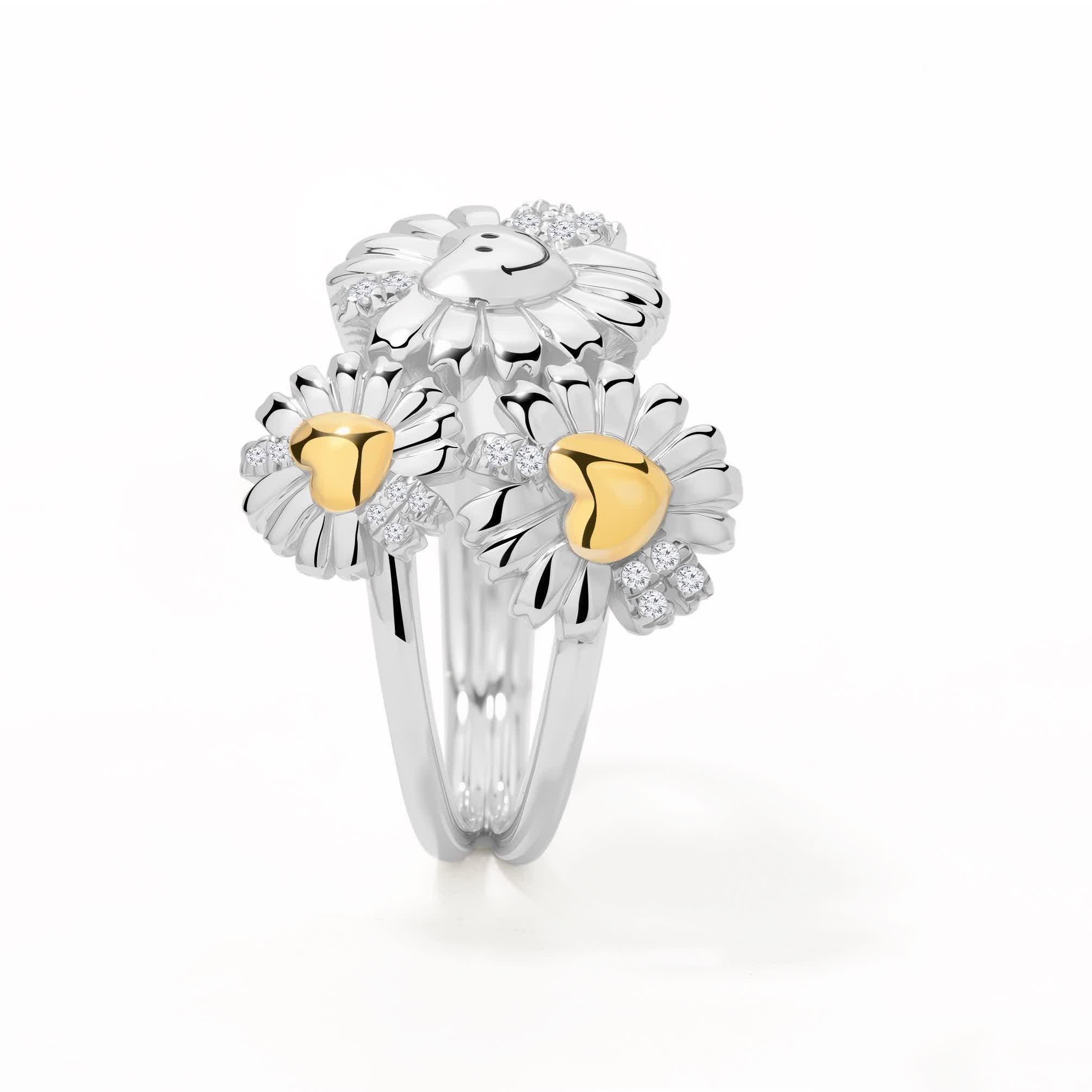 From the 2025 SMILEY® × KKLUE collaboration, the Daisy Heart Triple Flower Ring captures joy in bloom. Crafted in 925 sterling silver and accented with cubic zirconia, it features three enamel-finished daisies—two with soft two-tone plating, and one engraved with the iconic Smiley® face at the center.
