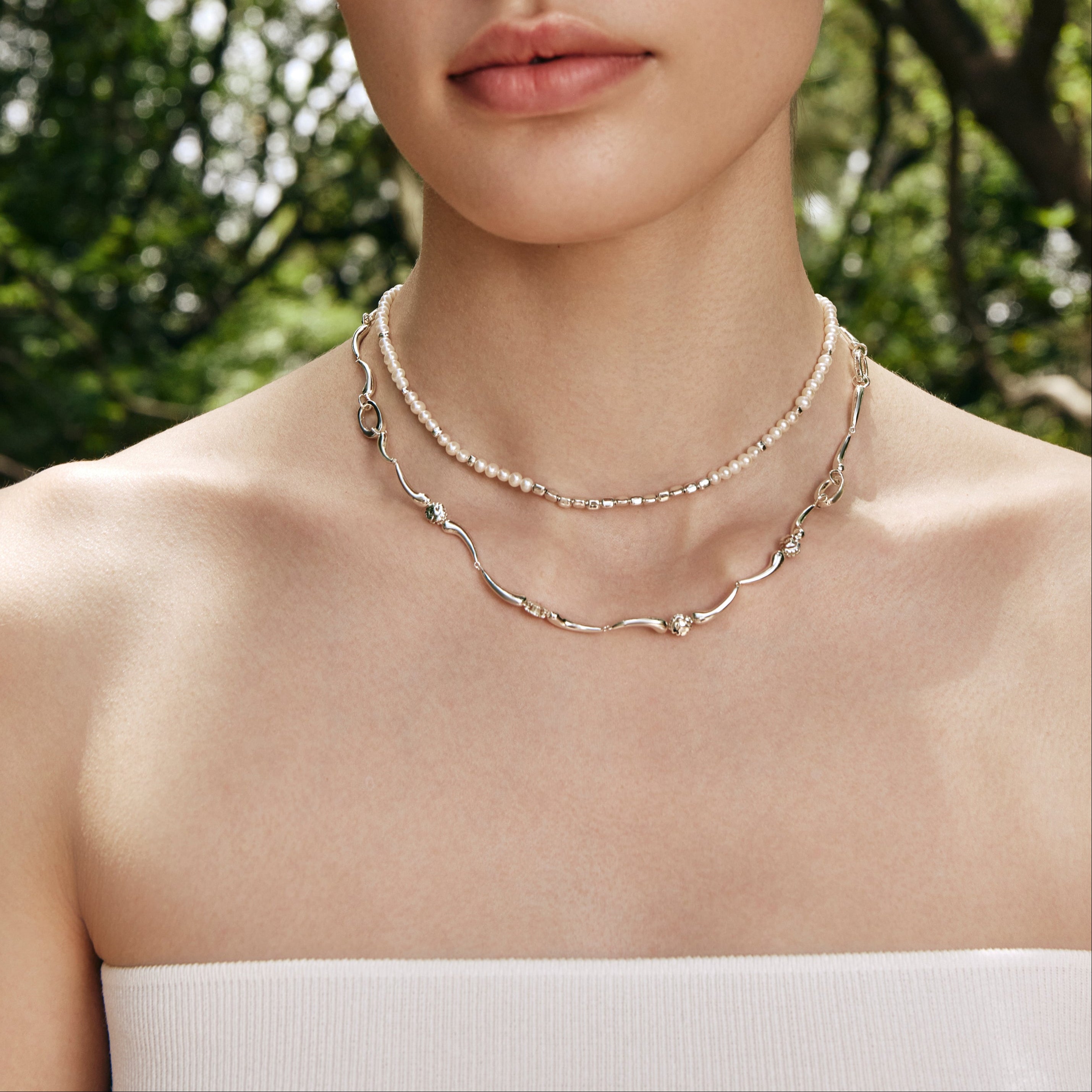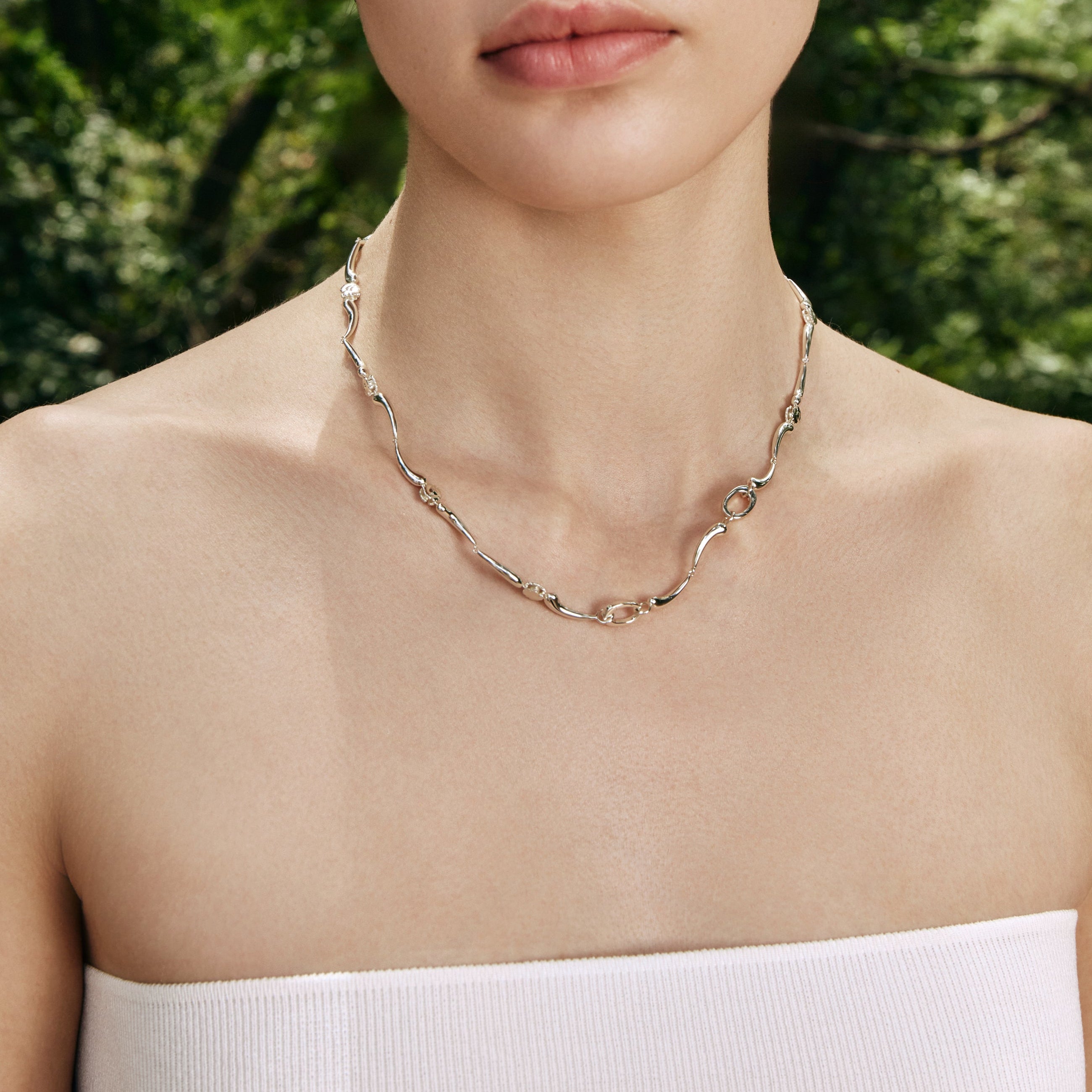 From the 2025 SMILEY® × KKLUE collaboration, the Daisy Heart Silver Wave Teardrop Necklace blends playful elegance with rhythmic design. Crafted in 925 sterling silver, the necklace features twelve daisy charms, each delicately spaced with two sculptural wave teardrop links, creating a flowing silhouette of joy and movement.