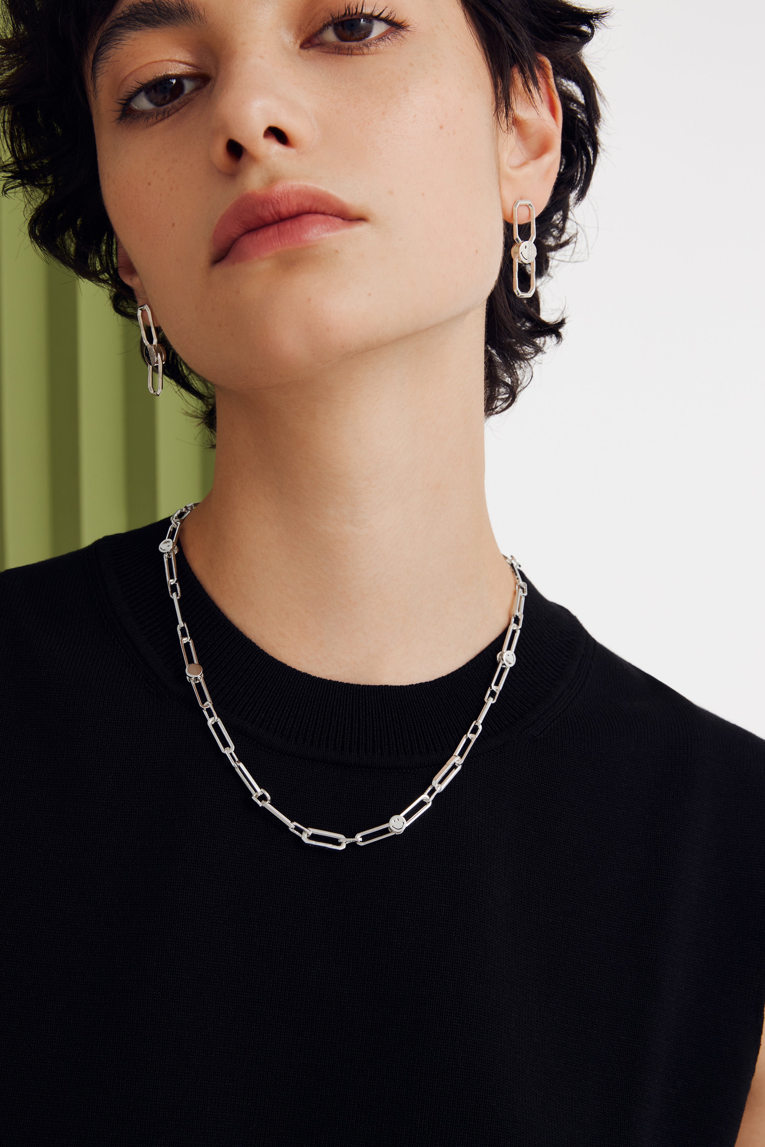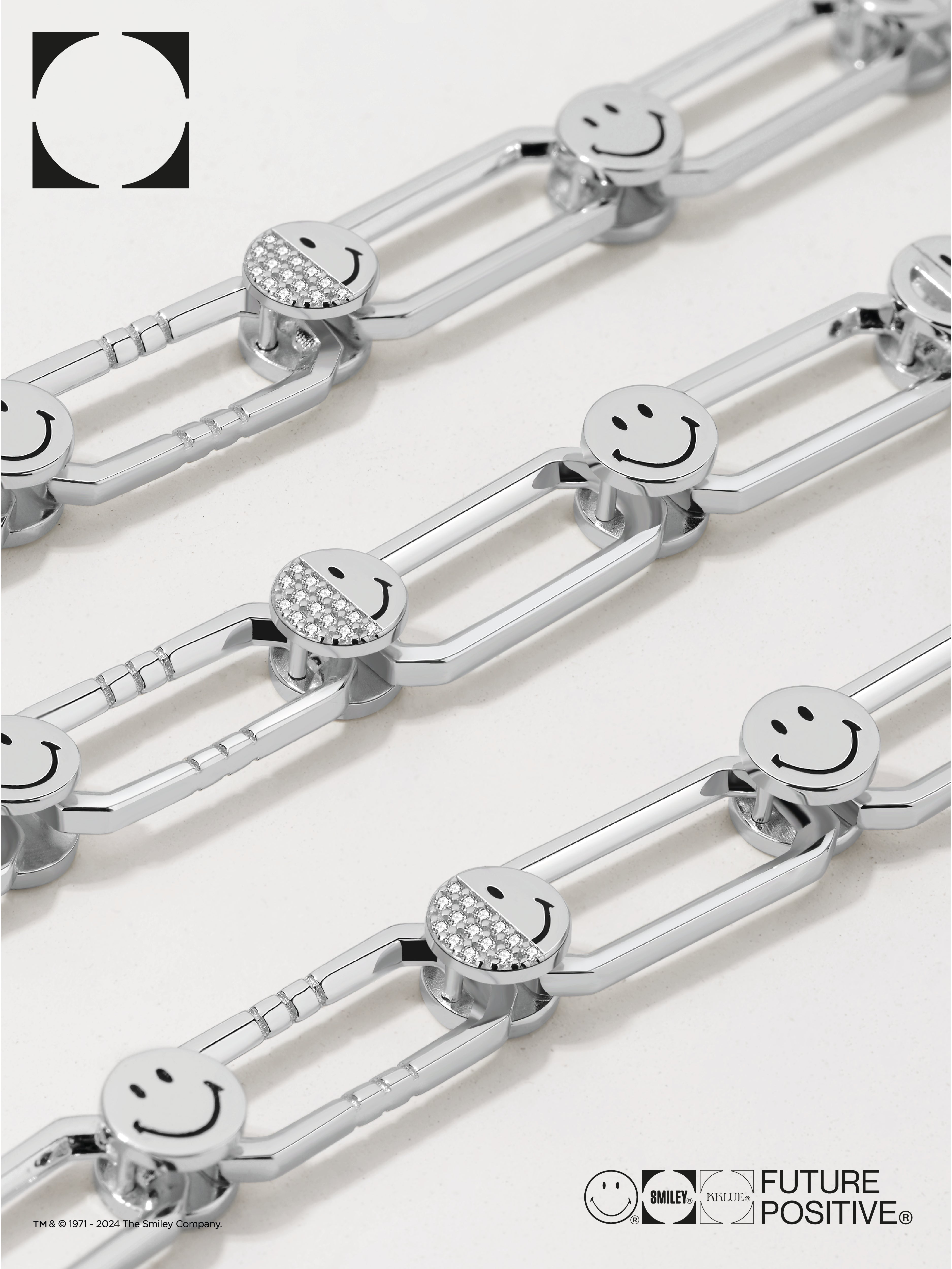 A best-seller, the Smiley Silver Elio Link Set features the Elio Smiley Link Bracelet and Necklace, offering endless styling possibilities. Designed with four openable connectors, these versatile pieces allow for multiple ways to wear—style them separately or connect the bracelet and necklace together to create a longer statement chain.