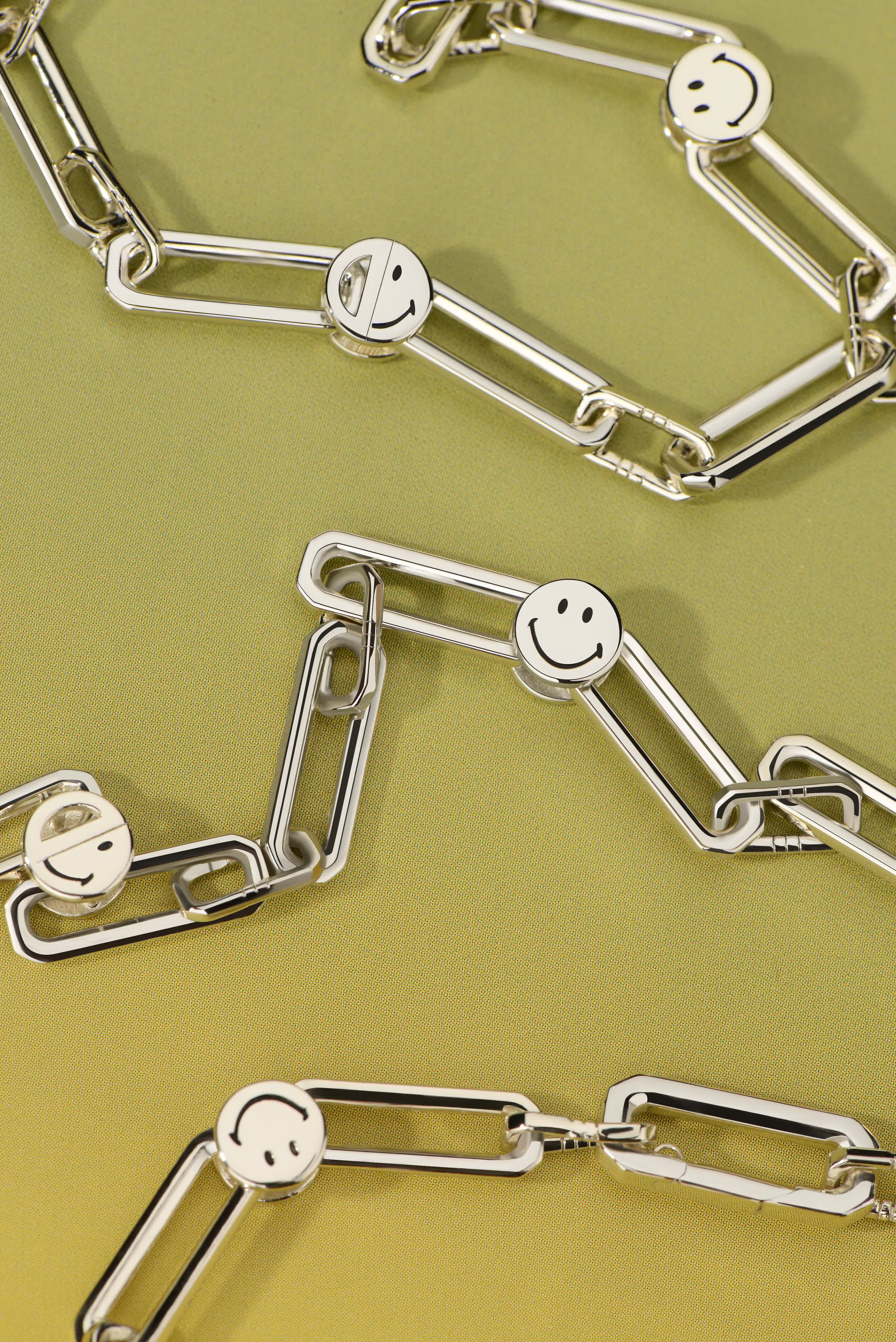 The Smiley Elio Link Bracelet is a versatile everyday statement piece crafted from recycled sterling silver. Featuring four openable grooved connectors and unique Smiley face joint links, this design allows free movement and limitless styling possibilities.