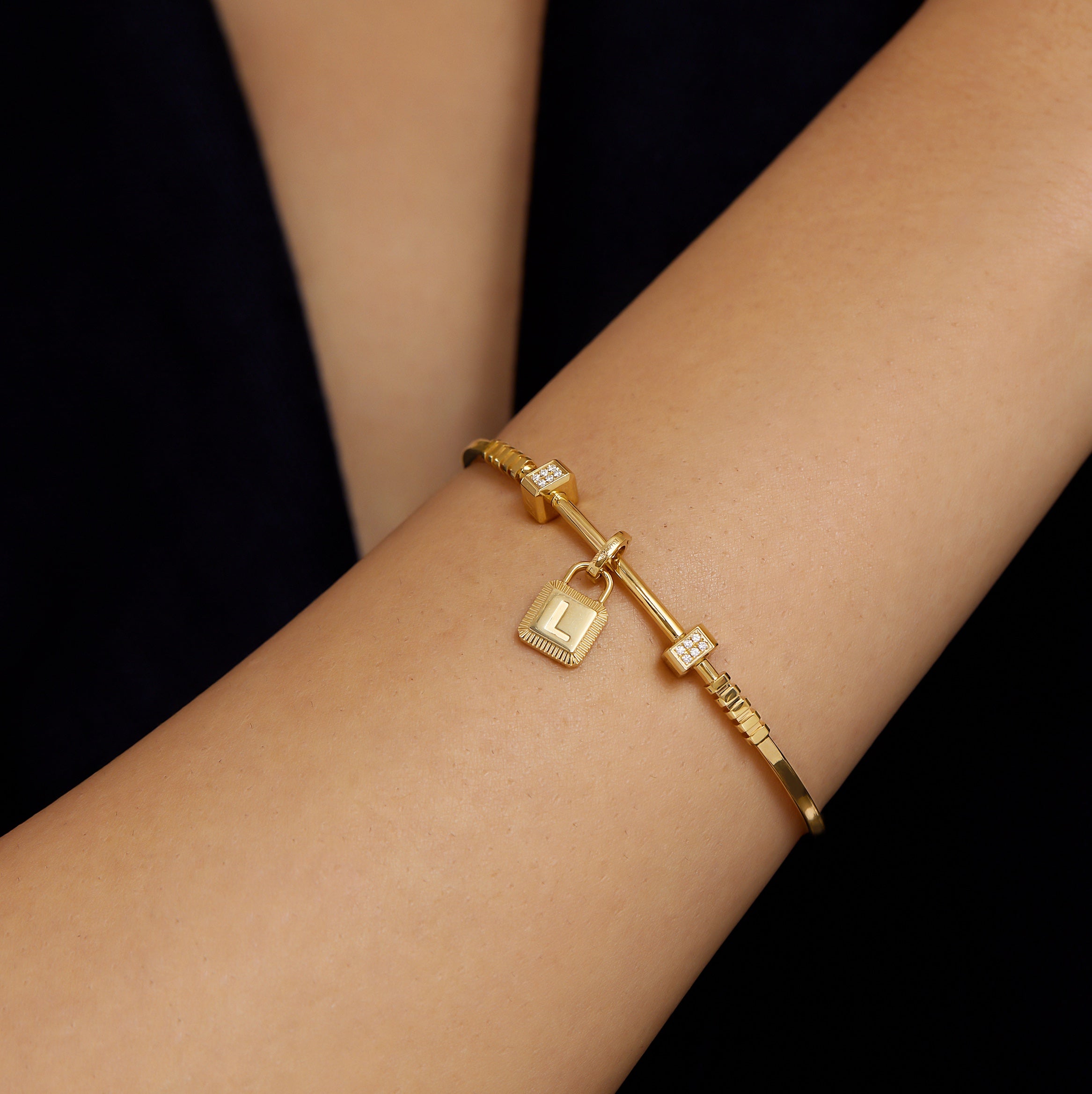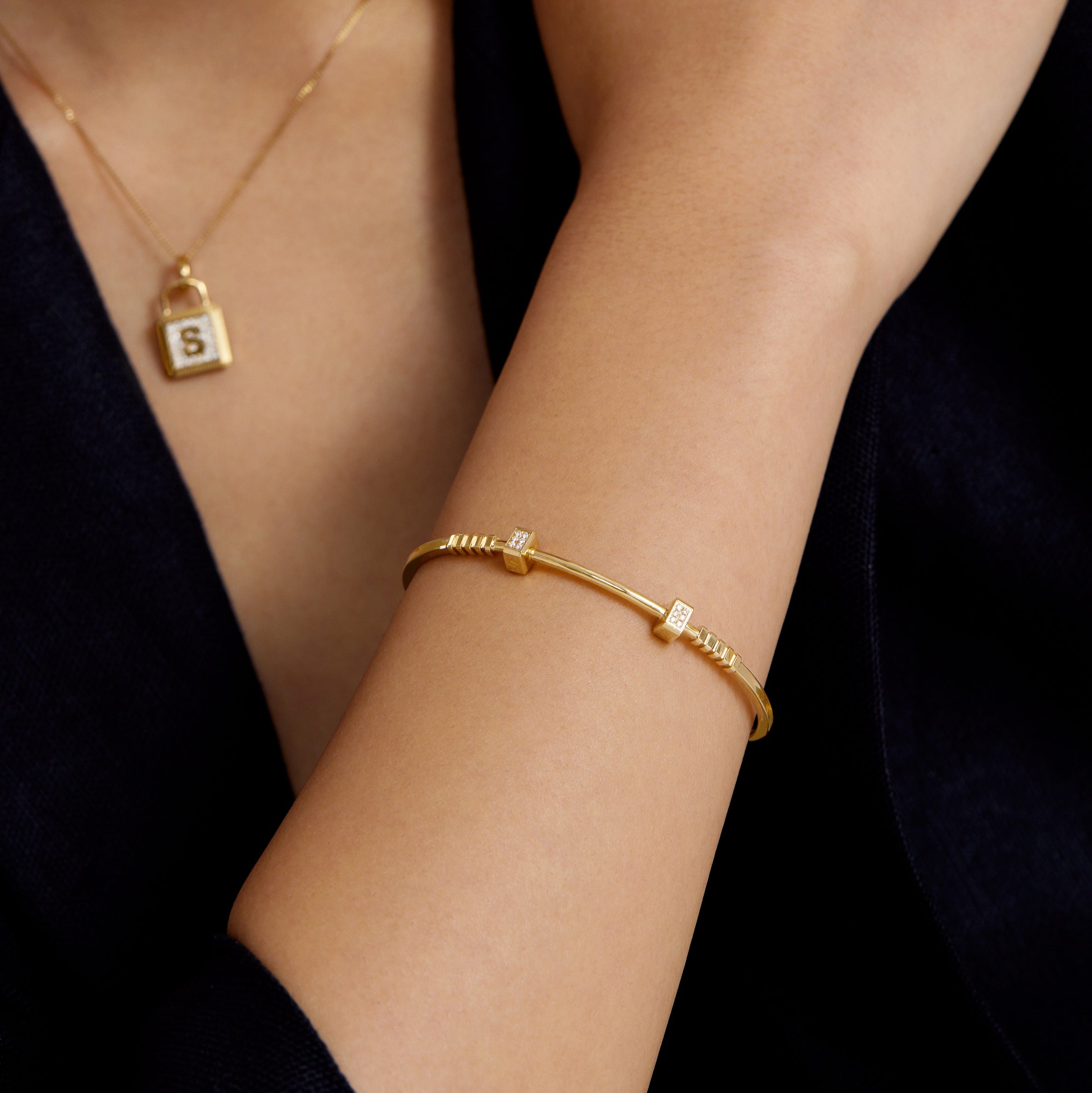 Unlock endless possibilities with the Unlock 18K Gold Pendant Bangle. Designed to hold different KKLUE pendants, this innovative piece allows you to DIY your own charm bangle. Featuring a screw-opening mechanism, it offers effortless customization while maintaining a sleek, structured look.